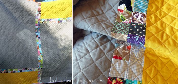 Was habe ich im Januar geschrieben? Quilts erzählen oft eine eigene Geschichte? Ja, das ist wohl wahr, dieser Quilt wird mich wohl dann immer an sein Entstehungsjahr erinnern. Die Rückseite spricht dann für sich – viel Grau, aber auch Sonnenschein und bunte Flecken als Hoffnungsträger…