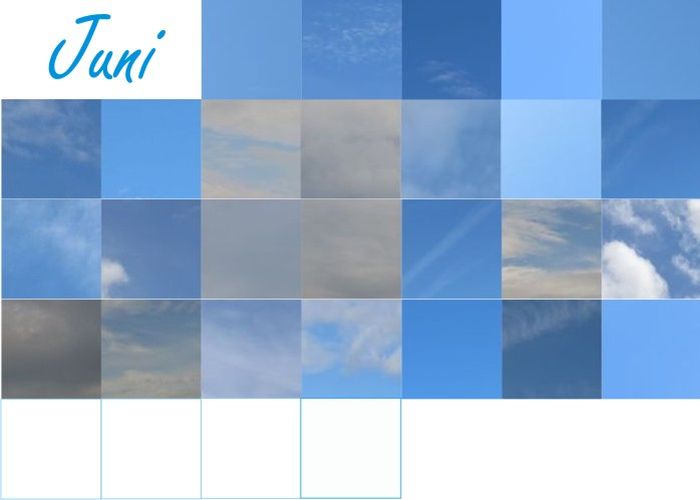 Noch fehlen mir vier Tage, um den Junihimmel zu vollenden, aber er sieht ja schon musterhaft aus. Was für ein Fortschritt Richtung Sommer und welch ein Unterschied zum Maihimmel (die anderen Monatshimmel). Klar, als Junikind bin ich da eh nicht neutral, Juni ist immer wunderbar….