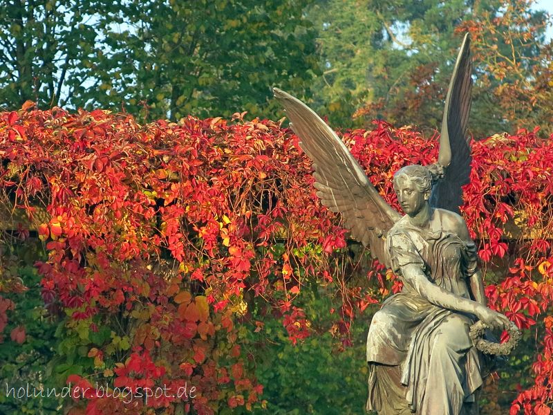Wie verschwenderisch werden die Farbtöpfe umgestoßen. Eine passende Stelle für den Engel im nun (fast) verblühten Rosengarten: Umkränzt von rotem Weinlaub, da kann eigentlich nur noch der nahe Gingkobaum mithalten.