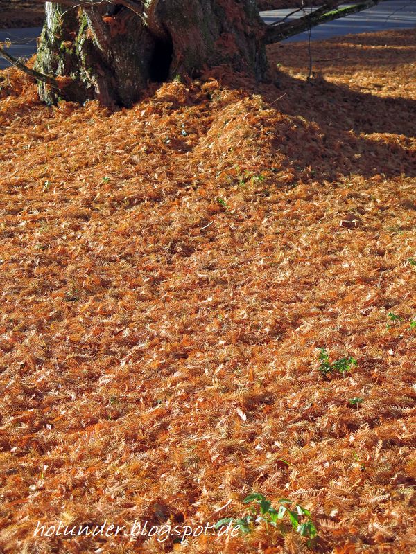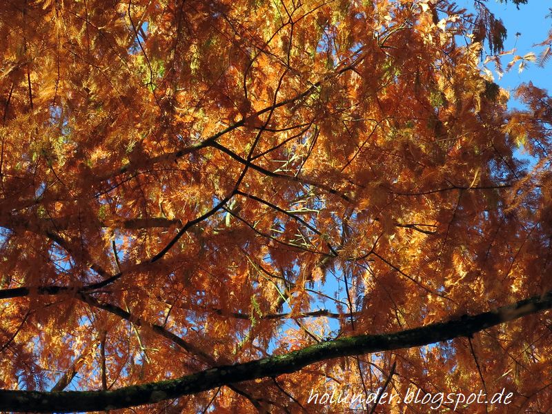 Ich liebe den kupfernen Herbstton des Laubes, aber auch den frisch grünen im Frühjahr. Neben dem Grab der Mutter ist ein Carree mit Sumpfzypressen, das fasziniert mich auch immer wieder. ( Sind wohl miteinander verwandt ).