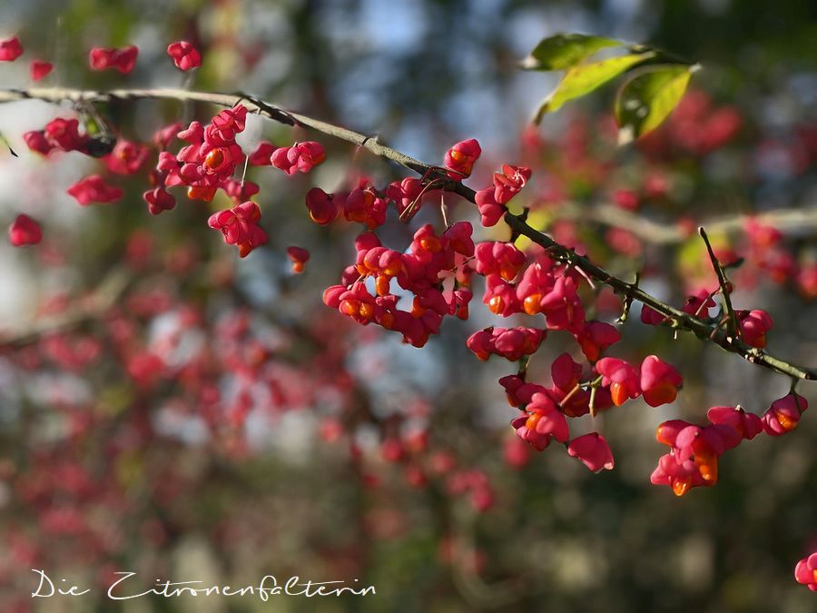 Pfaffenhütchen sind zwar giftig, aber draußen machen sie mit ihren knalligen Farben große Freude. Dieser Strauch hier war schon von weitem zu sehen, so sehr leuchtete er.