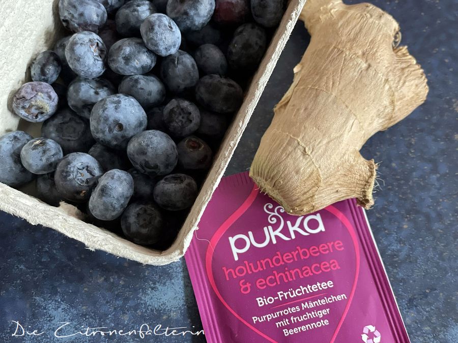 Die Heidelbeeren stehen für Obst und buntes Gemüse. Der Ingwer wandert in dieser Form (frisch gehackt oder gerieben) ins Essen oder den Tee. Ja, gesunder Tee muss auch sein. Und dann natürlich viel Bewegung an frischer Luft bei jedem Wetter.