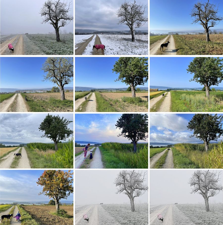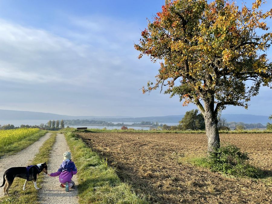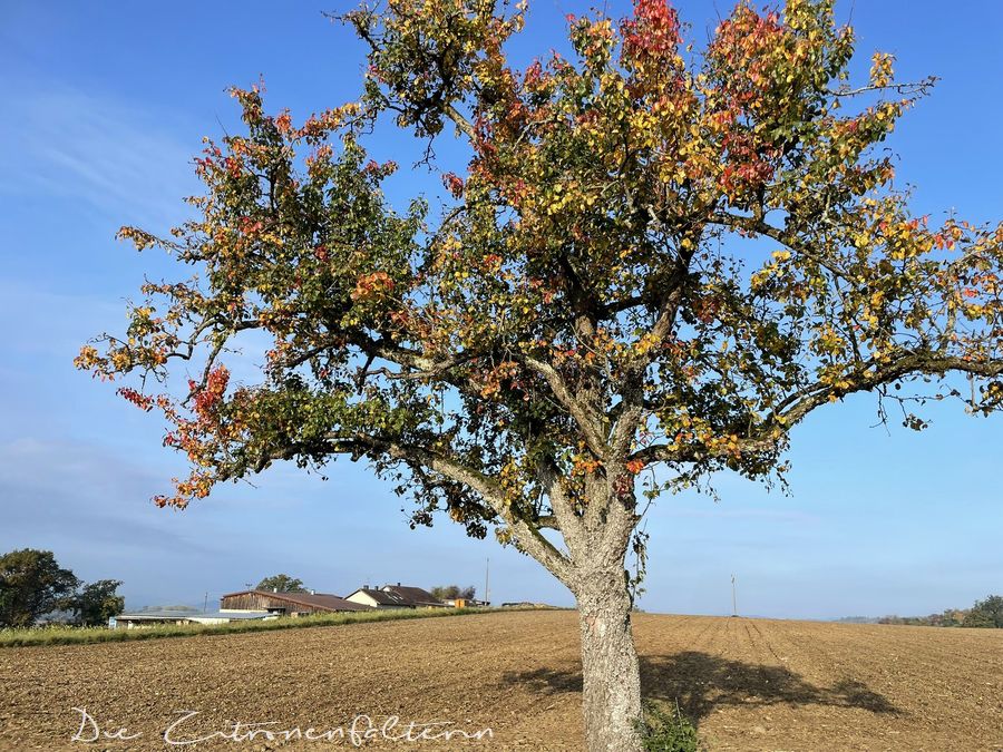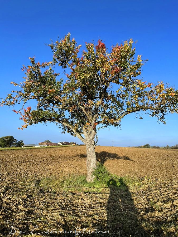 Der Mais auf dem rechten Feld ist längst geerntet. Auf dem linken Feld leuchtet der gelbe Senf als Gründüngung. Ich war am Vortag schon hier bei klarem blauen Himmel, aber da war meine junge Begleitung nicht zufrieden mit dem Foto-Ergebnis (im Gegensatz zu mir…) Also aufs Neue. Dieses Mal mit ein paar Wolken, aber trotzdem leuchtenden Laub.