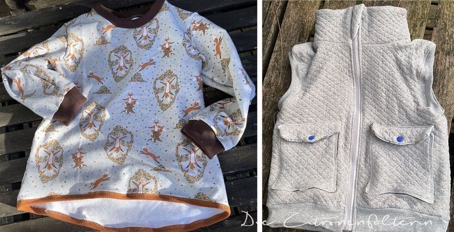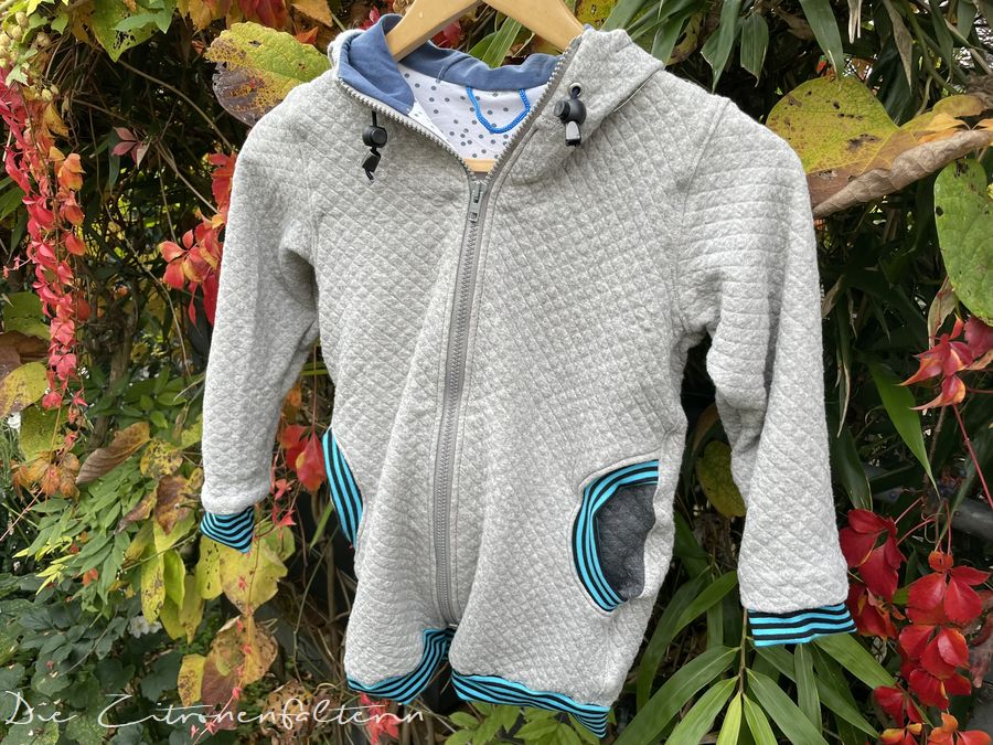 Dabei fiel mir noch der feine Baumwollsteppstoff aus dem Fundus in die Finger. Perfekt, um für den Buben noch eine warme, gefütterte Weste zum Drüberziehen und eine Herbstjacke mit Kapuze zu nähen – alles aus dem Stoffschrank. Projektaufgabe doch noch erfüllt.