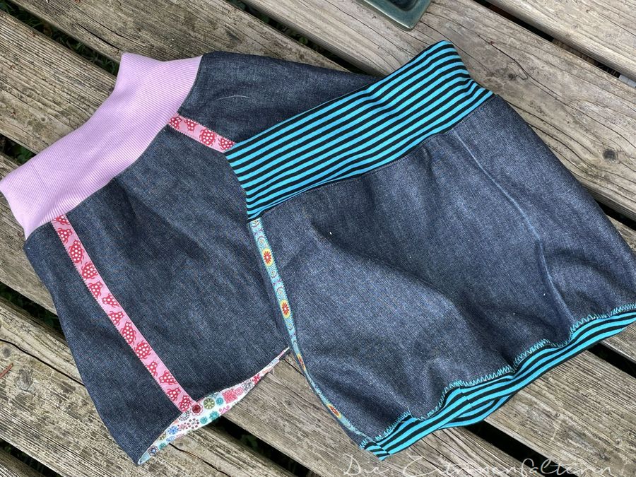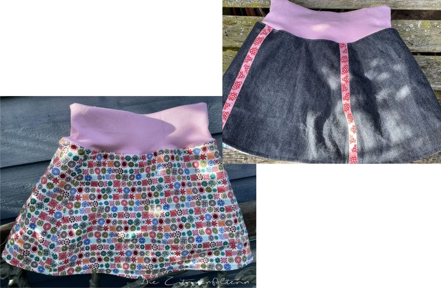 Das kleinste Mädchen verlangte nach Jeansröckchen. Gut, dass ich noch einen Jeansrest hatte. Mit einem warmen Kuschelfutterrest konnte ich einen Ballonrock und einen Wenderock nähen. Das war wieder ein super Abbau der Stoffreste.