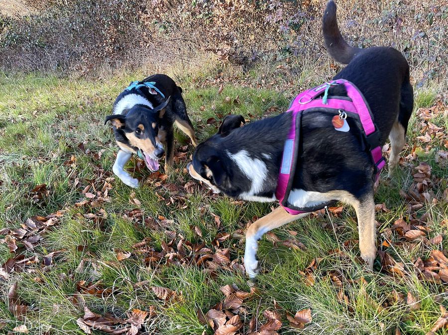Die Hunde beim Toben mit der Handykamera zu fotografieren ist nicht einfach, aber sehr lustig. Pixie rast ständig aus dem Bild raus, während Flint sich schier in der Luft umdreht.