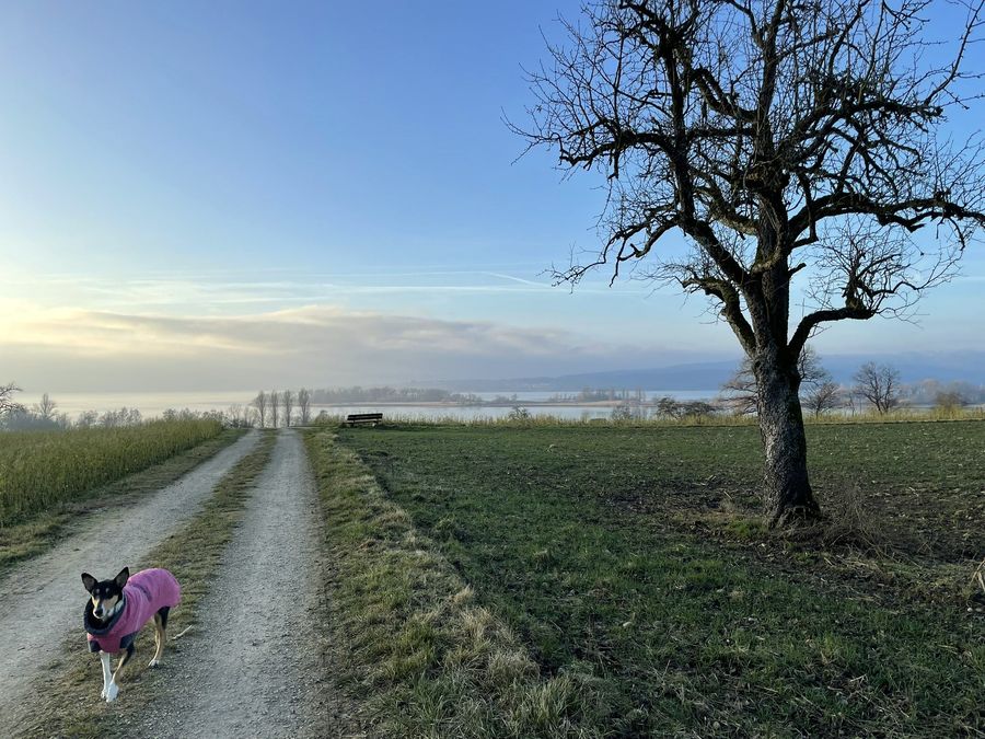 An diesem Sonntag bin ich gleich über die Wiese zum Fotostandort gelaufen. Sonne!! Tatsächlich kämpfte sich die Sonne durch den Nebel. Sicherheitshalber wollte ich gleich diesen Anblick einfangen. Nicht dass am Ende doch wieder das Grau obsiegt. Links in Richtung Konstanz liegt noch die Nebeldecke. Doch wir genießen schon das Licht. Gut, dass ich sofort gehandelt habe, denn am Tag darauf war alles wieder grau…