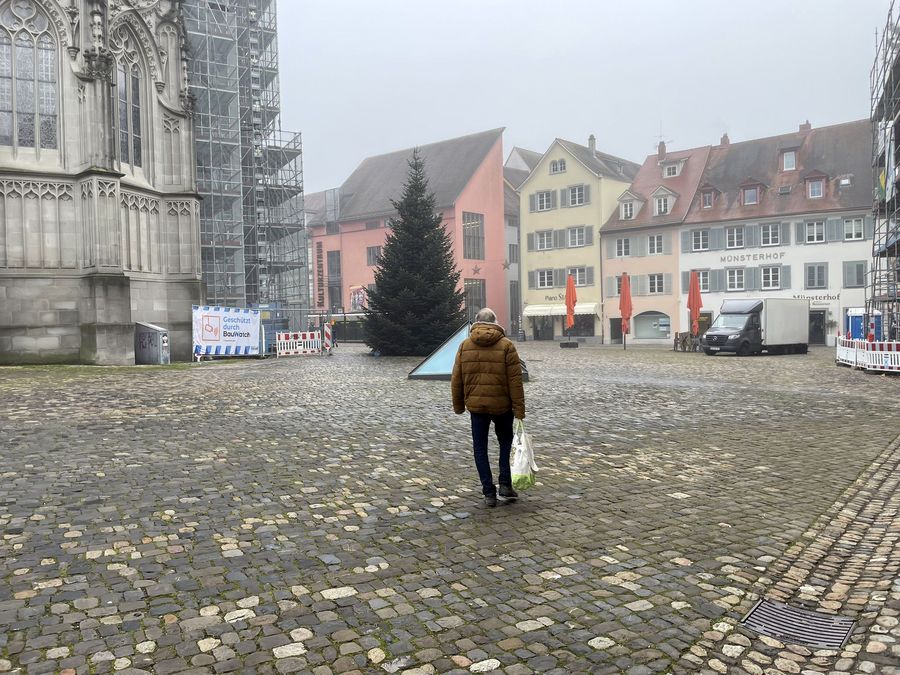 Noch haben die meisten Geschäfte an diesem Samstag vor Weihnachten geschlossen. Wir waren beim Bäcker und im Biosupermarkt und laufen noch mal über den leeren Münsterplatz. Die Baustelle auf den linken Seite ist inzwischen geschrumpft. Dafür steht wieder der große Weihnachtsbaum neben dem Brunnen. Und der Dezembernebel hat sich auch eingestellt.