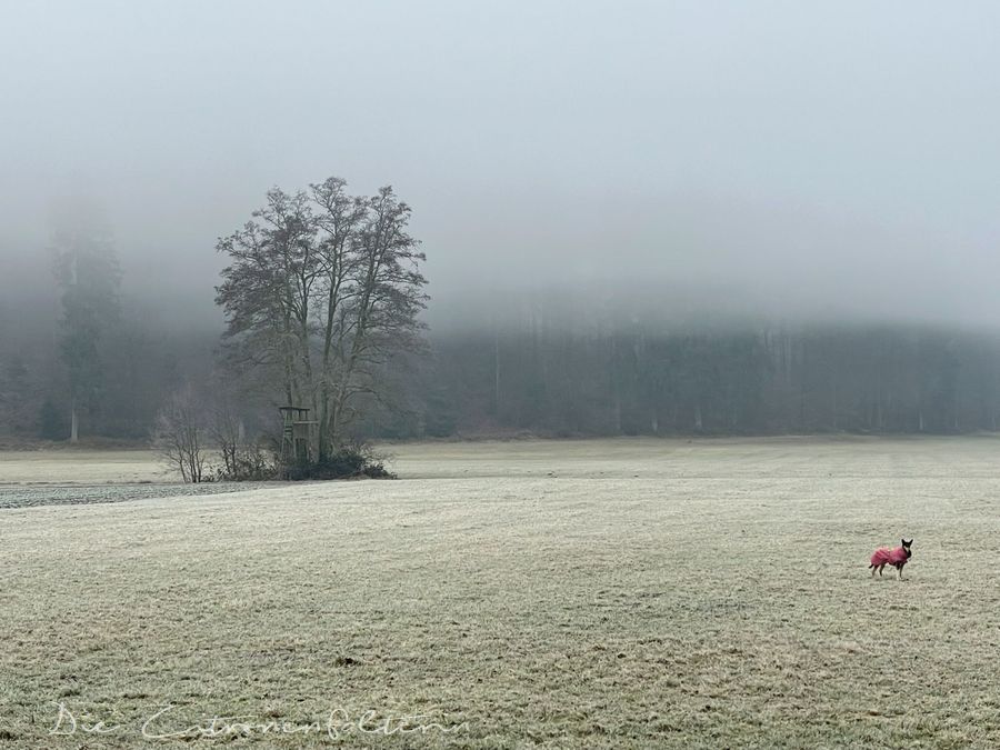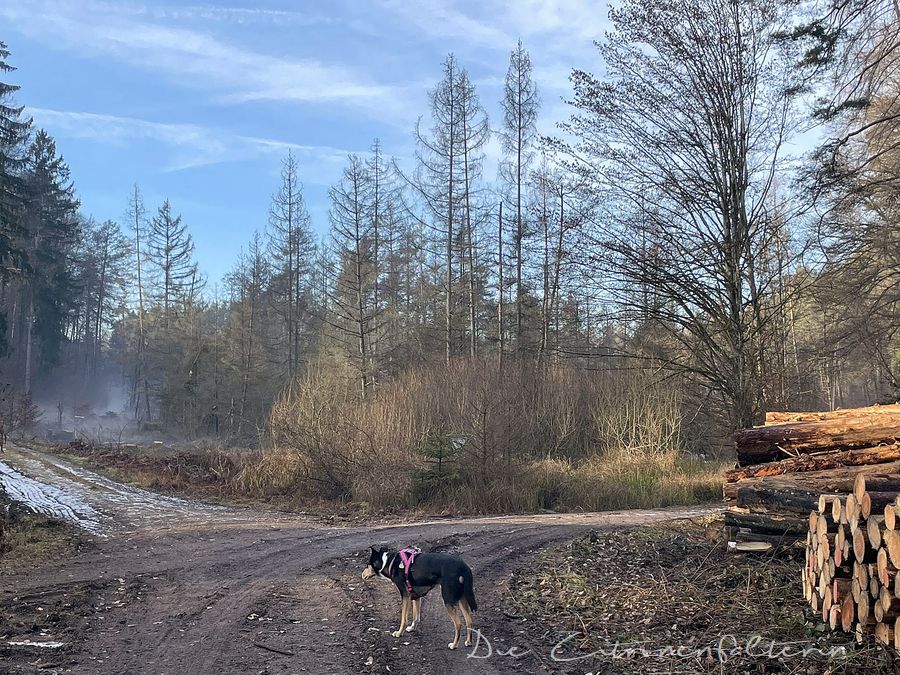 DRAUSSEN herrschte oft Nebel vor. Ich war schon froh, wenn er sich an manchen Tagen wenigstens am Nachmittag hob. Hier (unteres Foto) mussten wir uns auf der Hunderunde entscheiden: der linke Weg schien uns förmlich in die Winterkälte zu führen, während auf den rechten Weg die Wintersonne schien. Daheim haben wir uns DRINNEN am warmen Kamin wieder aufgewärmt. (Das hier war übrigens ein zauberhaftes Naturschutzgebiet, bevor auch an dieser Stelle wie gerade in allen Waldgebieten hier geholzt wird, als gälte es, jetzt noch schnell alles rauszuholen, was noch Geld bringt…).