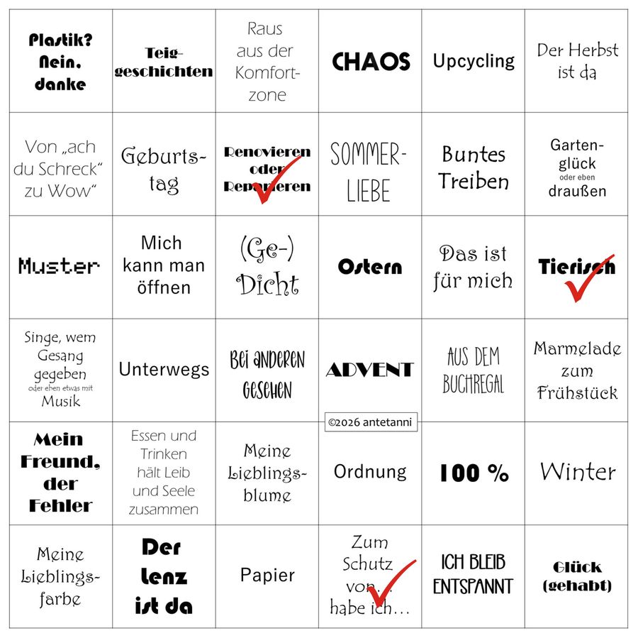 Beim Bingo (Mitmachaktion auf dem Blog von Antetanni) nehme ich zum ersten Mal teil. Nun bin ich ganz engagiert eingestiegen, denn da waren einige Themen, die es bei mir gleich klingeln ließen. Die große erste Zeigewoche startet zwar erst am 28.03.2026, aber man kann zwischendurch auch hier Einzelbeiträge verlinken.
