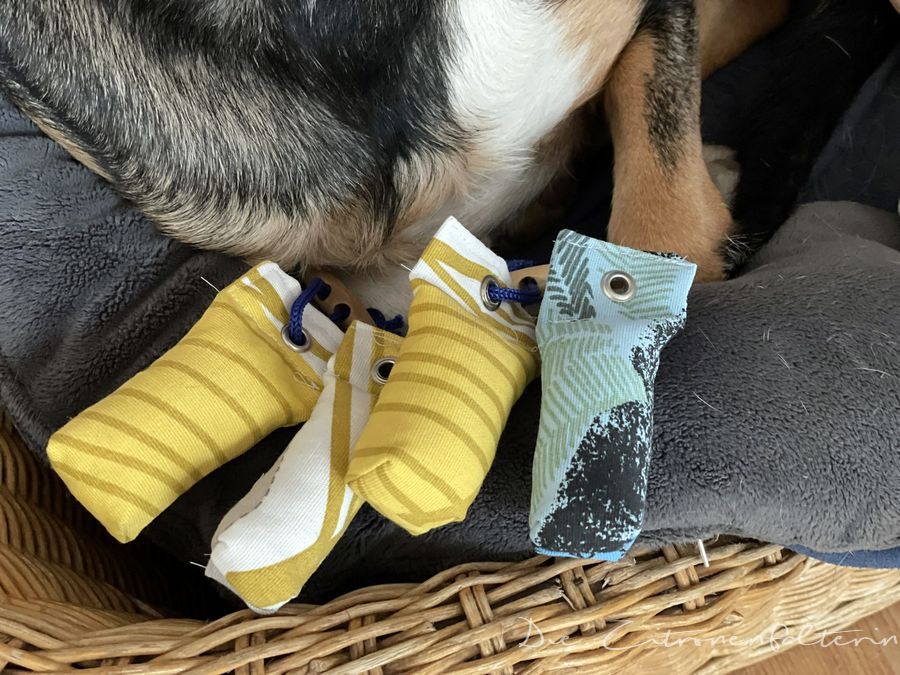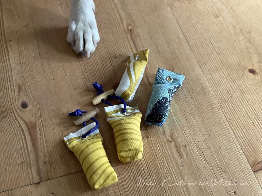 Ja, hier wurde auch was für die Tiere, sprich die Hunde gefertigt. Die Collies suchen nämlich begeistert ganz leichte, kleine versteckte Gegenstände – Minidummys. SIE finden sie auch immer wieder, wenn ich sie unterwegs verstecke. Nur ICH verbummele die kleinen Dinger gelegentlich. Billig sind sie nicht. Aber halt – sind sie doch so einfach mit stabilen Dekostoff-Resten nachzunähen! Sie dürfen doch gerne zur Tarnung auch gemustert sein. Also schnell ein tierisches Bündel genäht, befüllt, ge-öst – äh mit Ösen versehen – und von den Hunden gleich draußen getestet und für gut befunden.