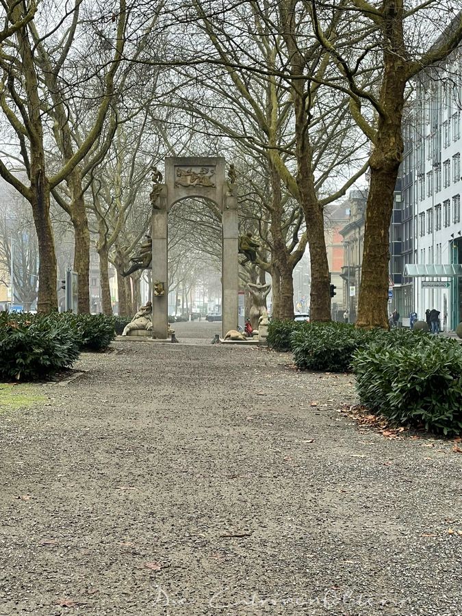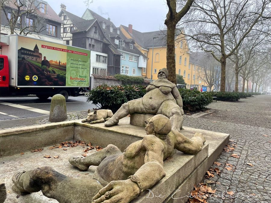 Zuerst durchquere ich den skurrilen “Konstanzer Triumphbogen” oder auch nach seinem Bildhauer Peter Lenk benannten Brunnen. Dreißig bekannte und unbekannte Personen stellt Lenk hier karikierend im Freizeitverhalten und Autowahn der heutigen Gesellschaft dar. Auch Motive des Konstanzer Konzils werden wieder aufgegriffen. Die Wasserspiele sind im Winter nicht zu sehen, deshalb sitzt der Herr hier auf dem Trockenen. Witzig, wie via des LKWs sogar die Insel Reichenau einen Blick auf den Brunnen wirft…