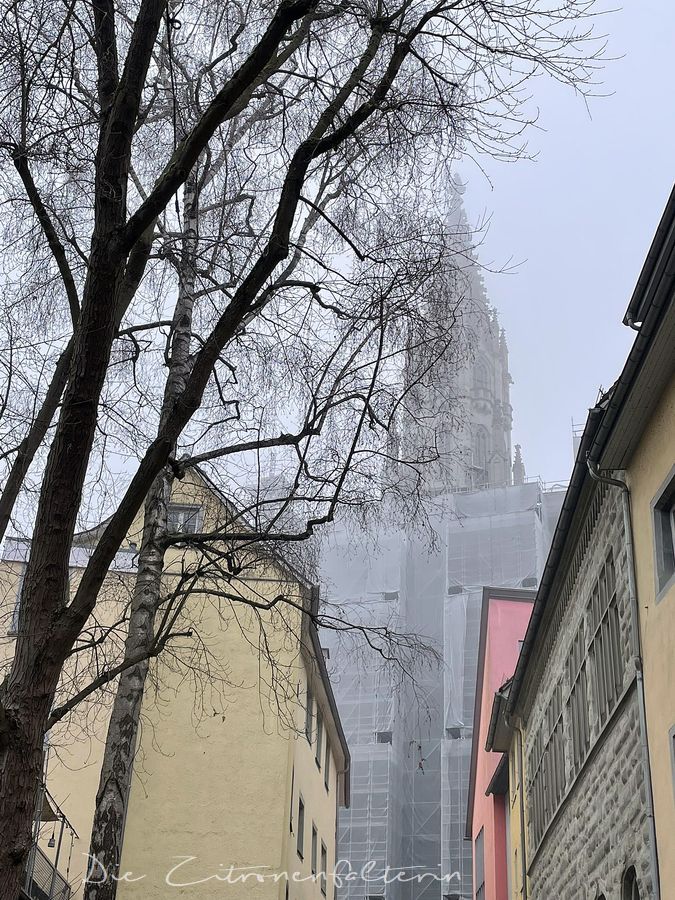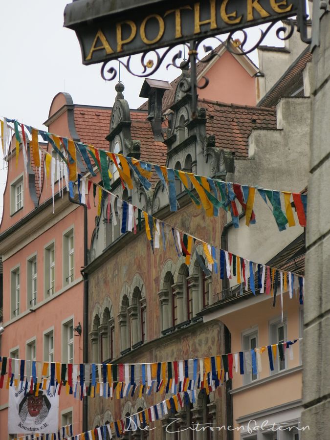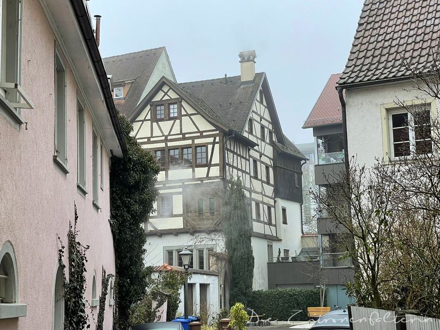 Der Münsterturm, der gerade eingerüstet ist und renoviert wird, taucht mit seiner Spitze mal wieder in den Nebel ein. Das Haus mit der Sandsteinfassade rechts ist übrigens das “Haus zur Katz”, die dieser Gasse ihren Namen schenkt: Katzgasse. Im Mittelalter war dies der Sitz der Gesellschaft “Zur Katz”, eine Vereinigung einflussreicher Familien der Stadt mit durchaus politischen und wirtschaftlichen Funktionen. Der Minnesänger Oswald von Wolkenstein war hier übrigens auch zu Gast. (Bei mir im Bücherregal steht seine sehr empfehlenswerte Biographie von Dieter Kühn: “Ich, Wolkenstein. Die Biographie”.) Ich schweife ab… aber hier in Konstanz kann man an jeder Häuserecke abschweifen. Da komme ich ja nie nach Hause…