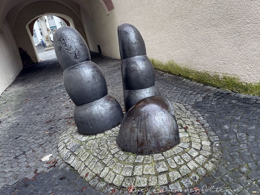 Kaum über die Laube und durch den Torbogen gelaufen, stoße ich auf die die Bronzeskulptur der “Konstanzer Schwurhand” (von Franz Gutmann). Das Bild des mittelalterlichen Schwurs bricht sich an dieser Stelle nicht ohne Grund durch das Pflaster, denn hier in der Altstadt befinden sich viele juristische Stätten. Gleich nebenan im alten Lanzenhof befindet sich die Konstanzer Staatsanwaltschaft.