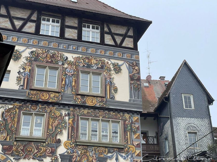 Ein Blick auf den Wohnturm “Zum goldenen Löwen”, hier die Gemälde des Hinterhauses. Entstanden ist der Wohnturm 1450, die Malerein sind von 1580. Hier duftet es ganz herrlich. Der feine Geruch stammt aus unserer Stamm-Bäckerei auf der anderen Seite der Gasse.
