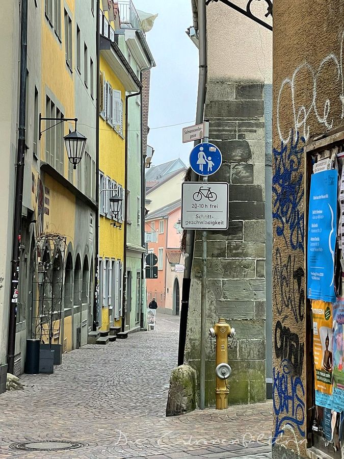 Winkelig geht es in der schmalen Salmannsweilergasse weiter. Die Gasse führt hinab Richtung See und erhielt ihren Namen vom Pfleghof des Klosters Salem in Konstanz dem Salmannsweiler Hof, der leider 1866 abgerissen wurde. Konstanz hat sogar wie ihr seht “goldene” Hydranten, hier vor einem Juwelier.