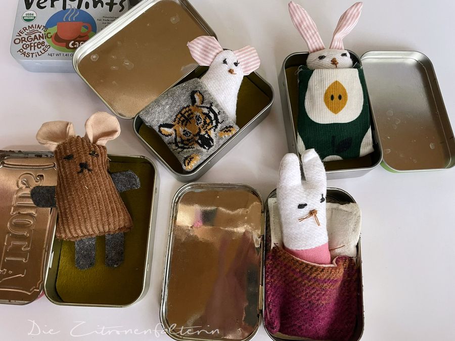 Vier Boxen bekamen tierische Bewohner, die nun auf einer passend zugeschnittenen Wollfilzmatratze liegen. Die Häschen bekamen eine Art Schlafsack und das Mäuschen eine Tigerdecke. Die Cordmaus ist so dick geraten, dass sie wohl lieber auf eine Hülle verzichtet.
