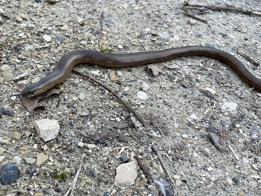 Noch ein Erlebnis: auf derselben Runde liegt da plötzlich eine Blindschleiche auf dem Weg. Pixie und ich schauen, staunen und lassen die Schleiche wieder in Ruhe.