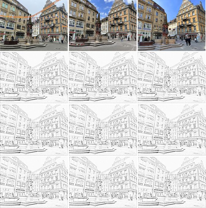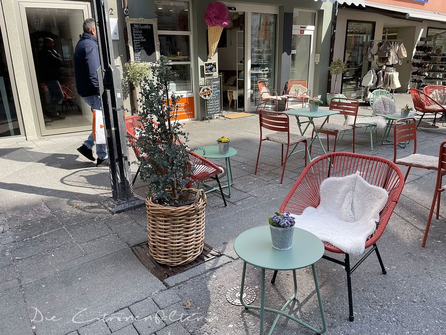 Mit der Frühlingssonne wurden auf der Marktstätte vor den Cafés Tische und Stühle aufgestellt (siehe unten). Folgedessen komme ich nicht mehr passgenau auf meinen Fotostandort. Naja, das gehört ja zum Spiel, seufz.