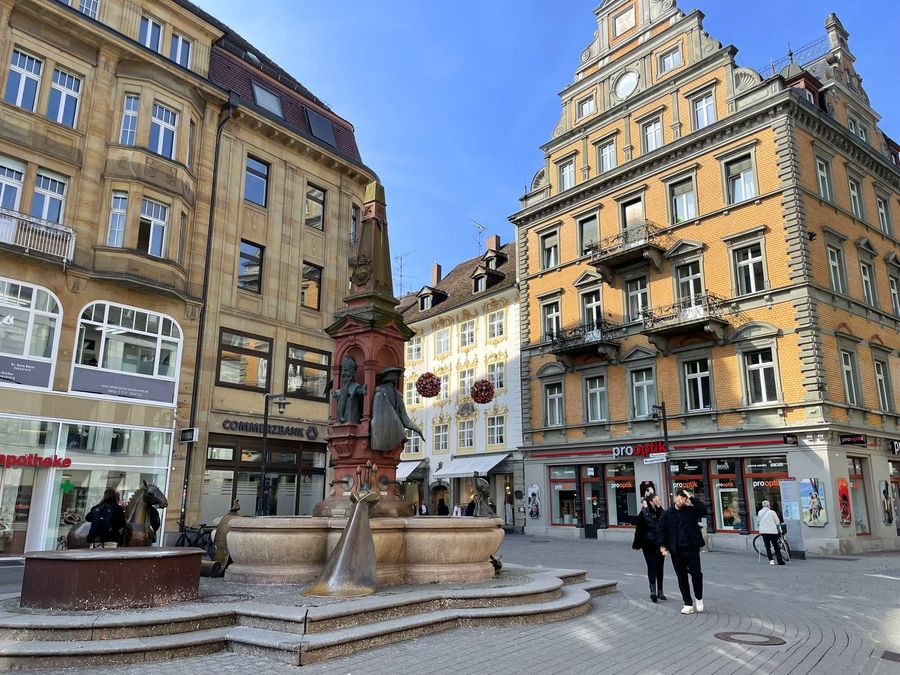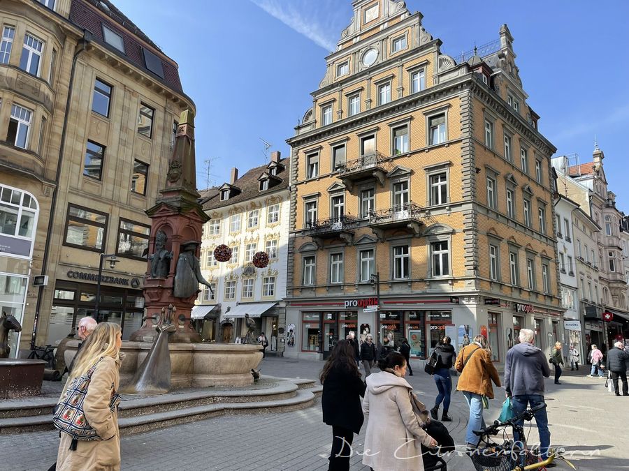 Mit dem Frühling ist auch wieder bunter Schmuck auf die Marktstätte eingekehrt. Doch ein Teil des Brunnens ist immer noch verpackt: das runde braune Objekt auf der linken Seite wartet bislang auf seine Enthüllung nach dem Winterschlaf.