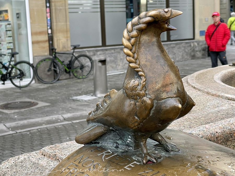 Der Legende nach sollen die Elwetritschen aus einer Kreuzung von bestimmten Geflügel wie Hühnern, Enten und Gänsen mit Waldelfen und Kobolden entstanden sein. Also scheu und schüchtern ist dieses Konstanzer Exemplar jedenfalls nicht. Es gibt wohl noch einiges an dem Friedensvertrag zu kommentieren…