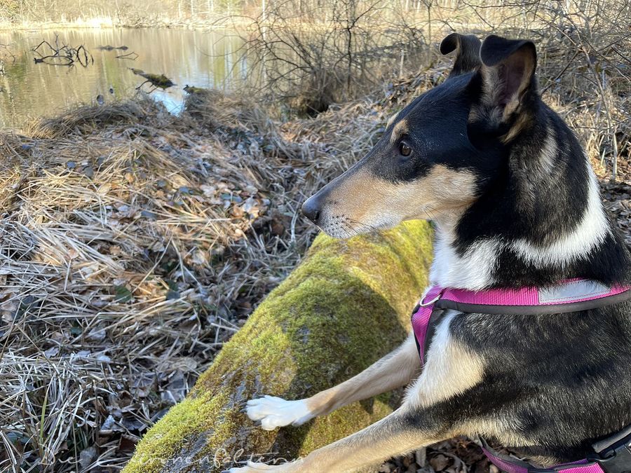 Flint schaut und lauscht sehr aufmerksam. Es gibt auch viel zu sehen und zu hören: Enten, Brandgänse, Gänse, Graureiher, Silberreiher, Blesshühner und Zwergtaucher konnte ich entdecken. Das war teilweise ein ziemlich lautes Geschnatter.