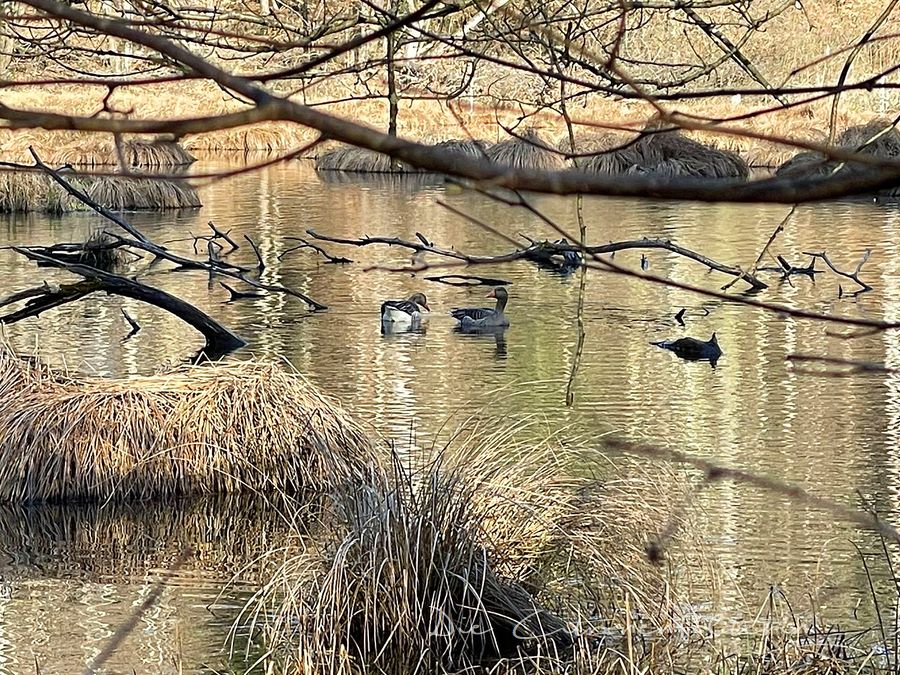 Im Januar konnte ich Schnee, im Februar eine Eisfläche bieten. Im März ging es am Teich sehr laut zu, was ich auf dem Blog leider weniger gut vermitteln kann. Man spürt, wie der Frühling mit den Hufen scharrt, doch der Winter grätschte am Monatsende nochmal frech ein.