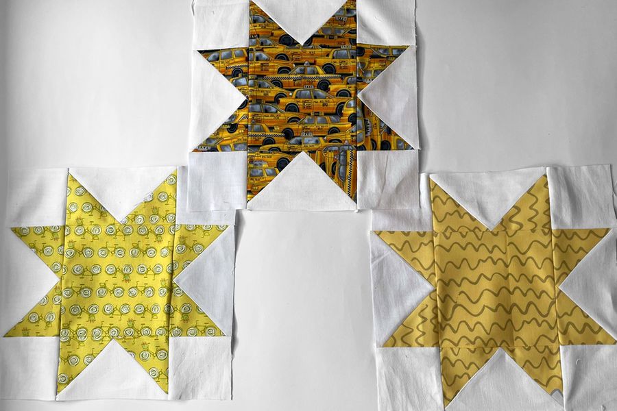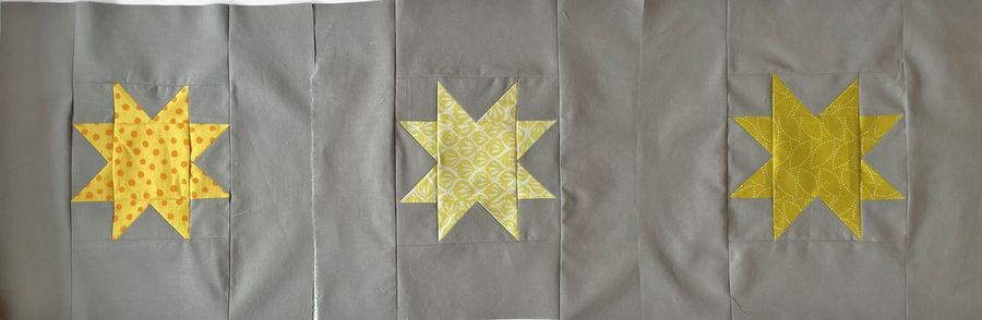 An Gelbtönen mangelte es im Stoffvorrat wirklich nicht. Endlich kam ich dem Fehlerteufel des Vormonats auf die Schliche. Im Februar war ich nämlich beim Nähen der “Flying Geese”, die bei den Zacken zum Einsatz kommen, auf die “No-Waste”-Methode umgestiegen. Dabei hat sich sowohl beim großen als auch beim kleinen Stern jeweils ein Übertragungsfehler eingeschlichen.